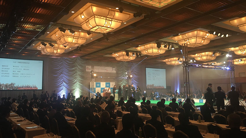 ラグビーのフィールドをイメージしたステージの施工・演出を
